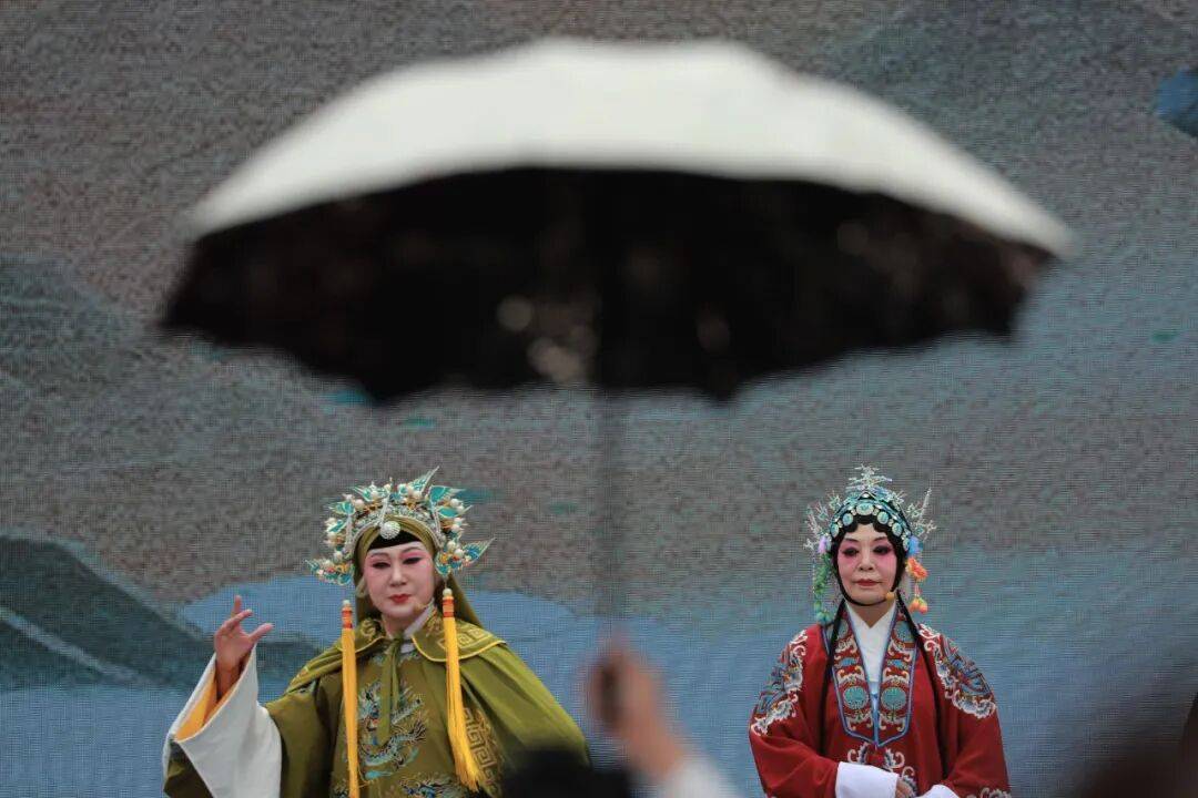 2025年5月18日,监利城区。浓墨重彩的舞台,演绎着穿越千年的爱恨情仇,一把遮阳伞,挡不住远年的风雨交加。
