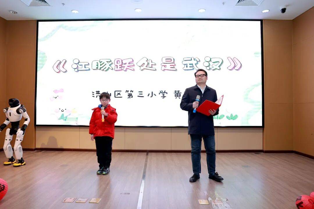 文艺表演环节精彩不断,舞蹈《梦莲水乡》、朗诵《江豚跃处是武汉》及古筝《万疆》等节目,展现传统文化魅力。活动最大亮点莫过于AI机器人的登场,它不仅随着音乐灵动起舞,还与图书馆IP“洪小图”趣味互动,进行问答、模仿等游戏,科技感十足,引来阵阵欢笑。