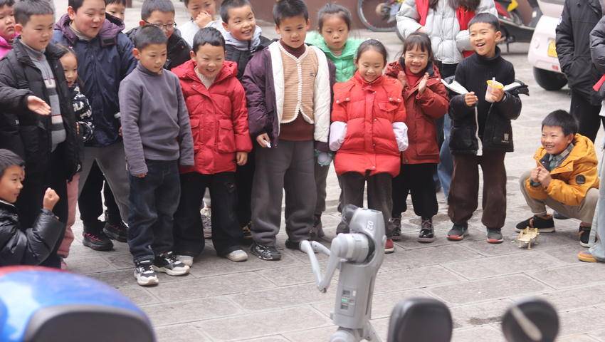 紧接着,智能机器狗登场,与孩子们展开互动。欢呼声中,好奇与求知欲在教室里流动——这是科技的温度,也是教育本该有的样子。