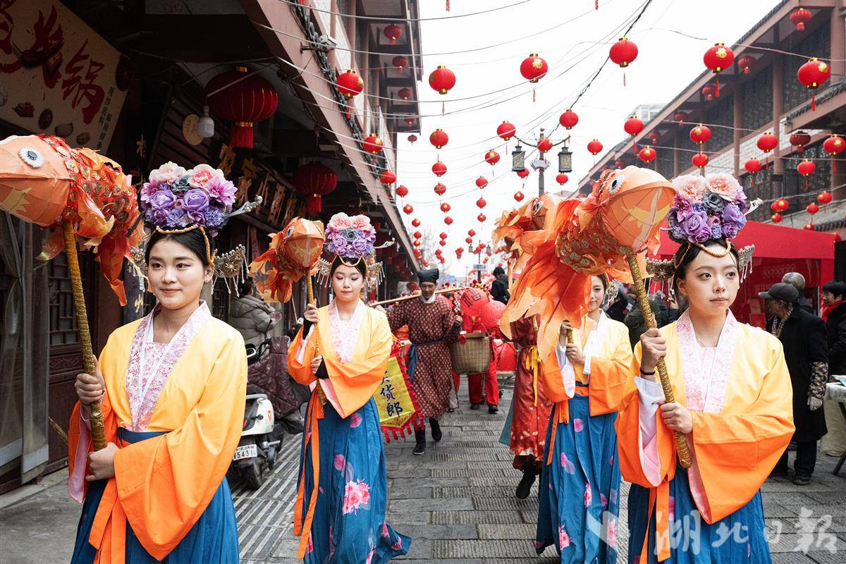 2月6日,几名身着传统服饰的女子举着鱼灯在茅庙集古街巡游。(湖北日报全媒记者 任勇 通讯员 刘颖 刘仪聆 摄)(湖北日报全媒记者 任勇 通讯员 刘颖 刘仪聆 摄)