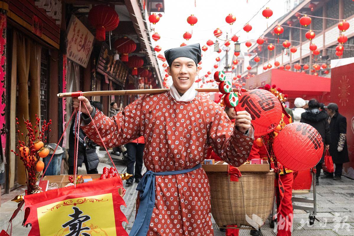 2月6日,一名演员身着传统服饰化身“卖货郎”,挑着货担沿着茅庙集古街吆喝。(湖北日报全媒记者 任勇 通讯员 刘颖 刘仪聆 摄)