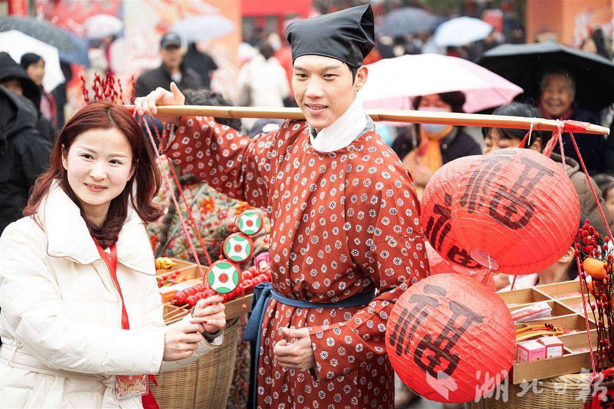 2月6日,市民与身着传统服饰的“卖货郎”合影留念。(湖北日报全媒记者 任勇 通讯员 刘颖 刘仪聆 摄)