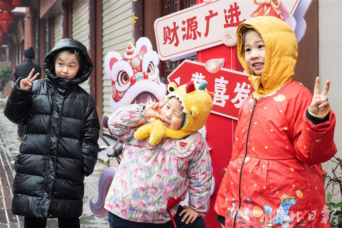 2月6日,小朋友在茅庙集古街合影。(湖北日报全媒记者 任勇 通讯员 刘颖 刘仪聆 摄)