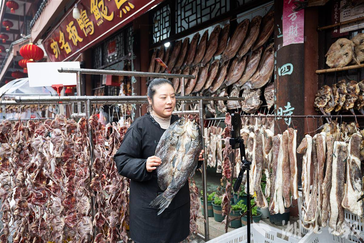 2月6日,一名腊味店老板在茅庙集古街的门店前直播带货。(湖北日报全媒记者 任勇 通讯员 刘颖 刘仪聆 摄)