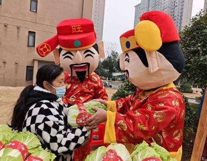 “财神到,财神到,好走快两步!”随着喜庆的背景音乐,“财神爷”亮相社区,手持金元宝与“恭喜发财”贺联,向居民派发“白菜”(寓意“百财”),老人们笑呵呵地接过象征吉祥的白菜,现场欢声笑语不断,新春的喜庆氛围瞬间拉满。