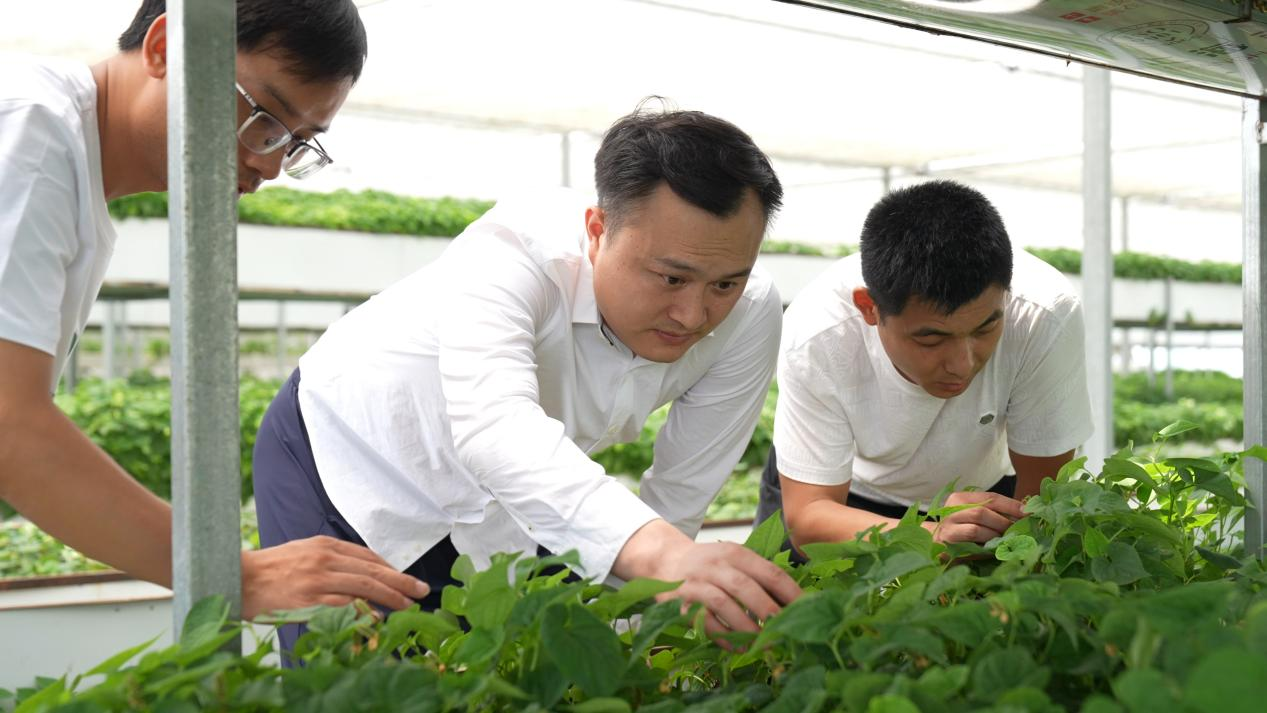 石苇(中)通过建设5G智慧大棚和鱼腥草种质资源圃,实现了种苗的统一培育和供应。通讯员供图。