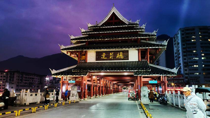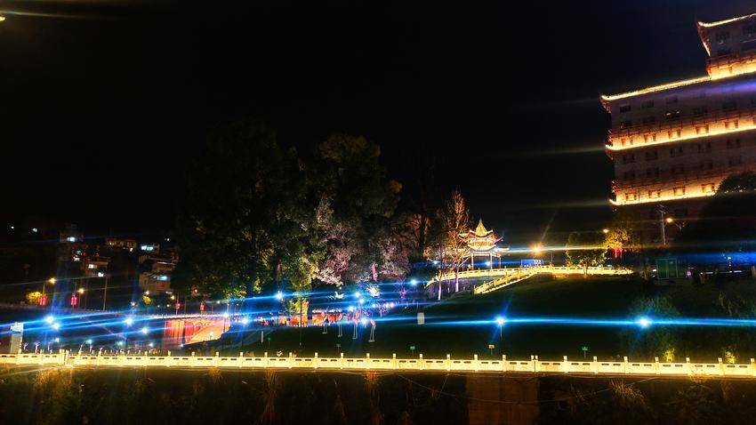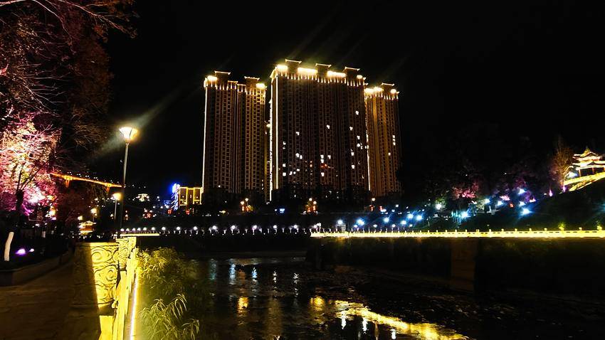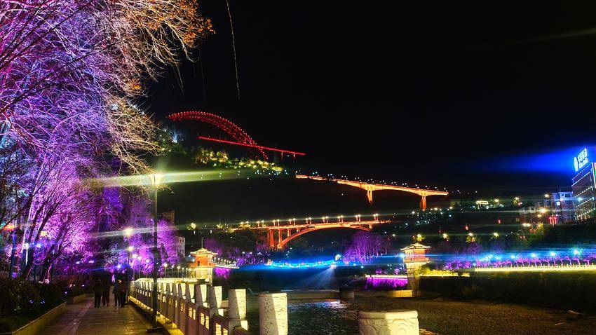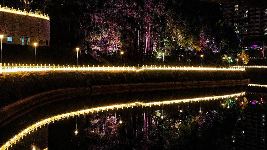 漫步鹤峰县城的亲水走廊,身旁的河面漾着万千华彩。七彩灯光次第铺展,赤橙黄绿青蓝紫交织成流动的锦缎,水波轻漾,将夜色晕染得温柔而绚烂。