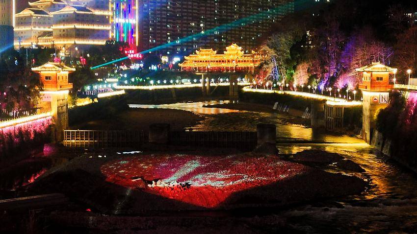 水中倒映出廊檐的曲线、灯影的碎金,行至立着大屏幕的吊桥,岸边的“爱心沙滩”愈发醒目,红色的爱心与两岸闪烁的灯光相映成趣。四座大桥如银带横卧,灯光次第变幻,时而如火龙腾跃,时而如星河垂岸,光影投映在水面,与岸边的霓虹光影交相辉映,织就一幅流动的夜色长卷。