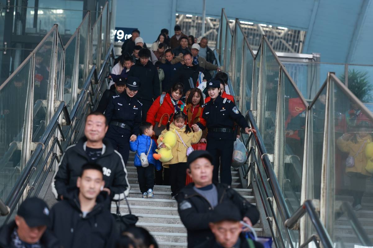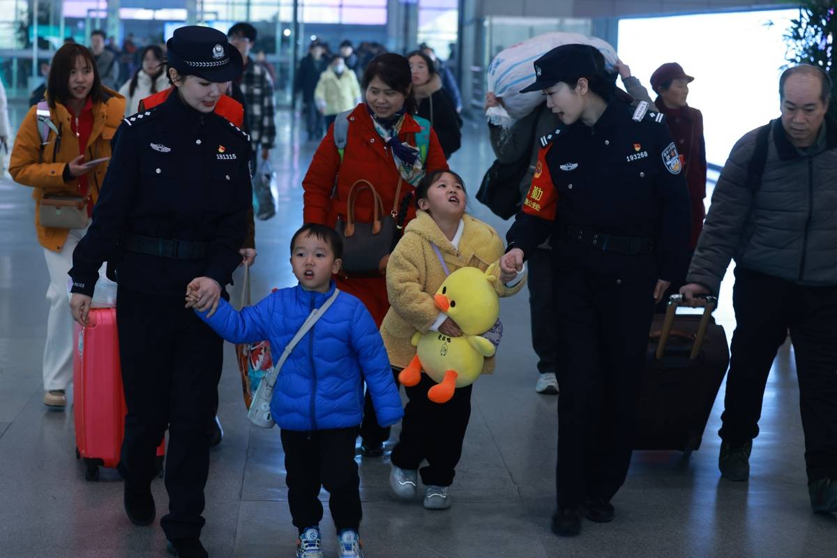 铁路民警在武昌火车站扶老携幼帮助旅客。