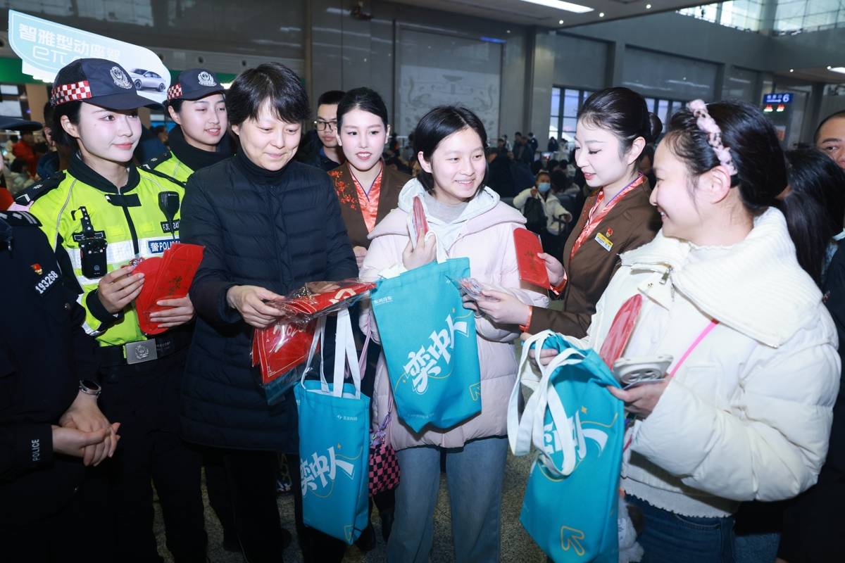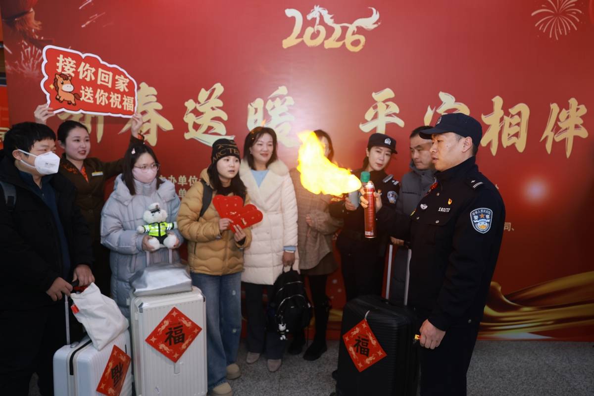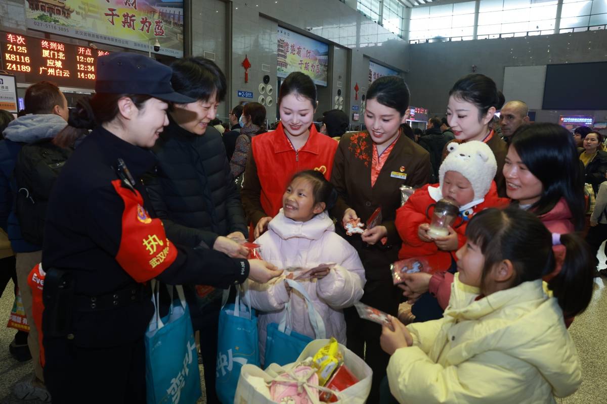 2月6日,武汉铁路迎来务工人员集中返乡高峰。武汉铁路警方联合武汉市公安局武昌区分局交通管理大队与武汉客运段、东风奕派汽车科技公司、湖北省保险行业协会等志愿者在湖北省武昌站为乘车返乡的务工人员、大学生铺就了一条安全又暖心的回家路,让丙午马年的春运满溢着守护与祝福。武汉铁路民警严格落实安检查危措施,筑牢旅客出行安全防线,同时用通俗易懂的语言讲解春运高发诈骗套路,提醒旅客看护好随身财物,为每一位归乡人吃下“定心丸”;武汉交警将交通安全手册与新春福袋同步发放,把平安叮嘱融入新春祝福,让返乡路更添稳稳的幸福;武汉客运段志愿者以“优服务、暖旅途、有温度”的行动,让旅客切实感受到铁路出行的优质服务与浓浓温情。(湖北日报通讯员 周婷 邵琦 摄)