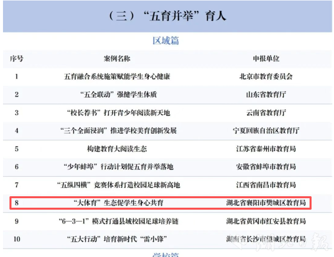 湖北日报客户端讯(通讯员付晓方、聂志鹏)2月6日,2025 年中国基础教育创新案例遴选结果公布,襄阳市樊城区教育局《“大体育”生态促学生身心共育》案例成功入选区域创新案例。该案例凭借鲜明的育人导向、创新的实践路径、显著的实施成效,从全国万余个申报案例中脱颖而出,成为基层教育探索“五育并举”、落实立德树人根本任务的典型范本。