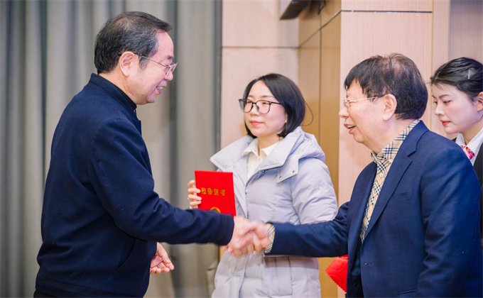武汉市长江新区管委会主任赵利洪向董事长刘纯啟颁发捐赠荣誉奖牌