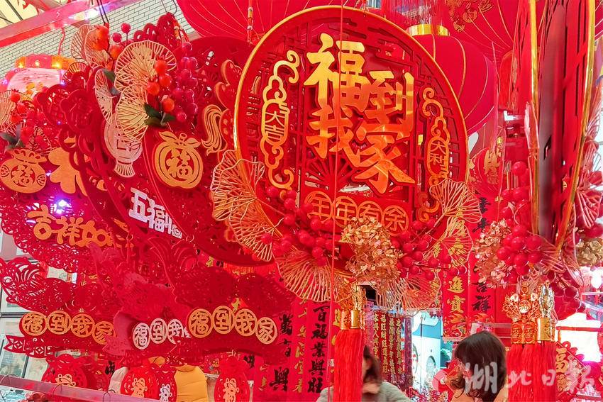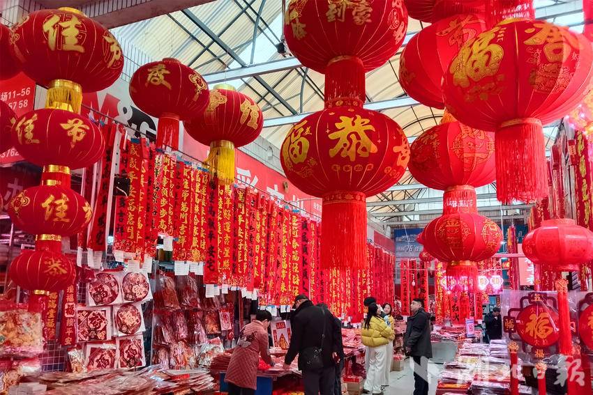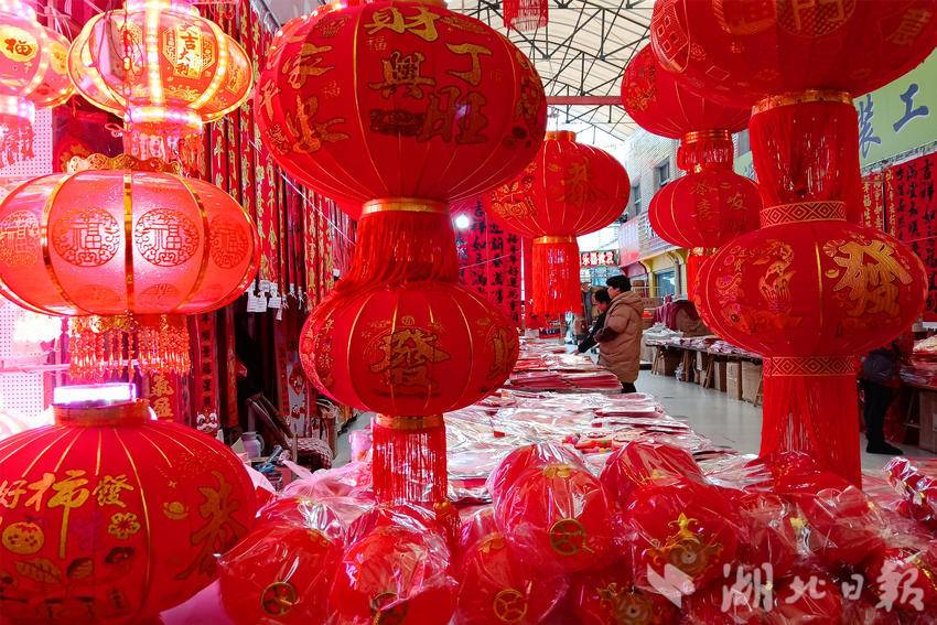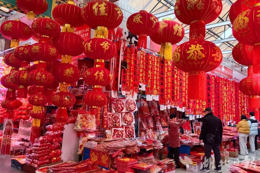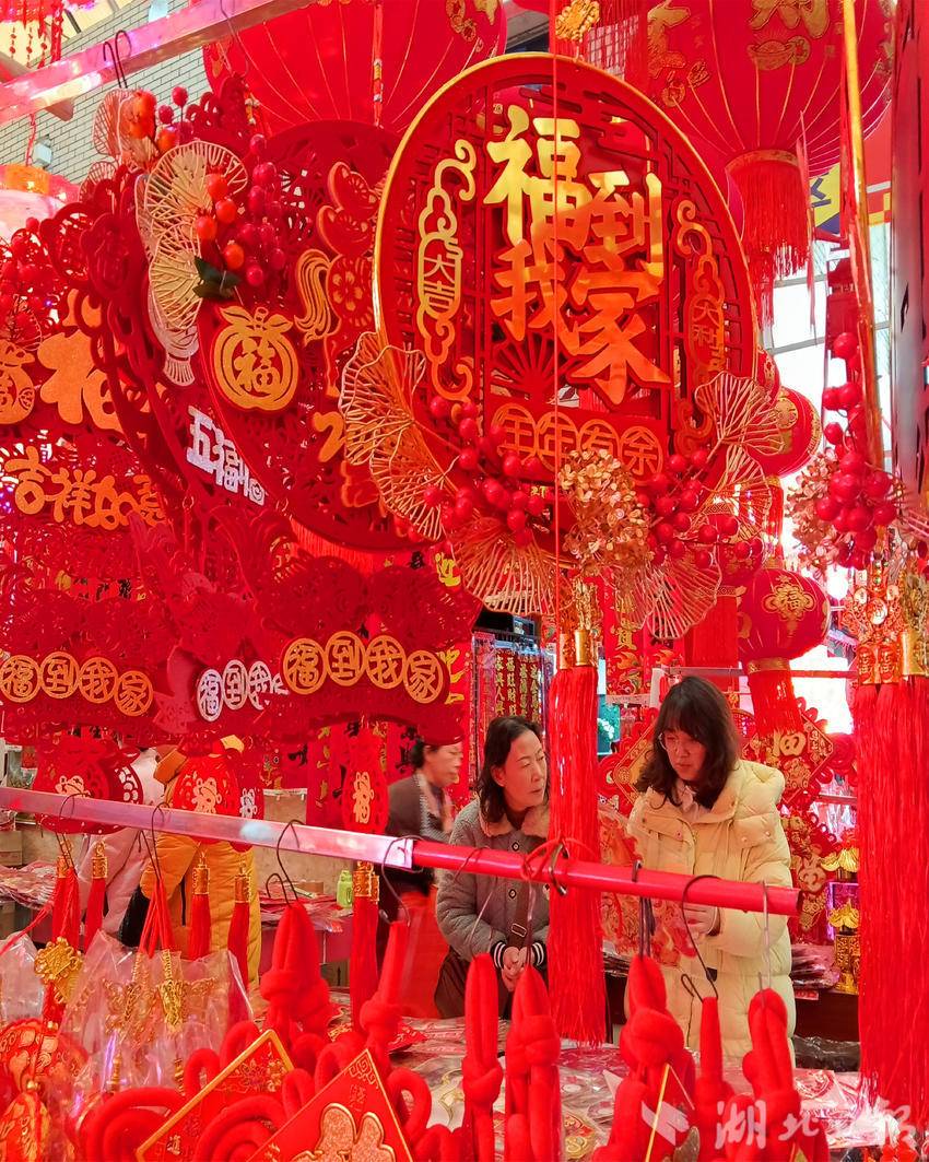 连日来,随着春节临近,宜昌各大市场的春联、灯笼等节庆饰品红红火火,市民精心挑选心仪的年货,喜庆的红色映衬出浓浓的年味,处处呈现一片祥和的节日氛围。图为市民在宜昌市夷陵区长江市场年货专区选购迎春接福饰品。(湖北日报客户端通讯员 张国荣 摄)