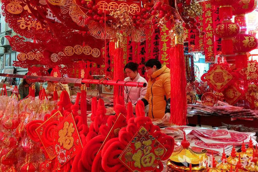 市民在宜昌市夷陵区长江市场年货专区选购迎春接福饰品。