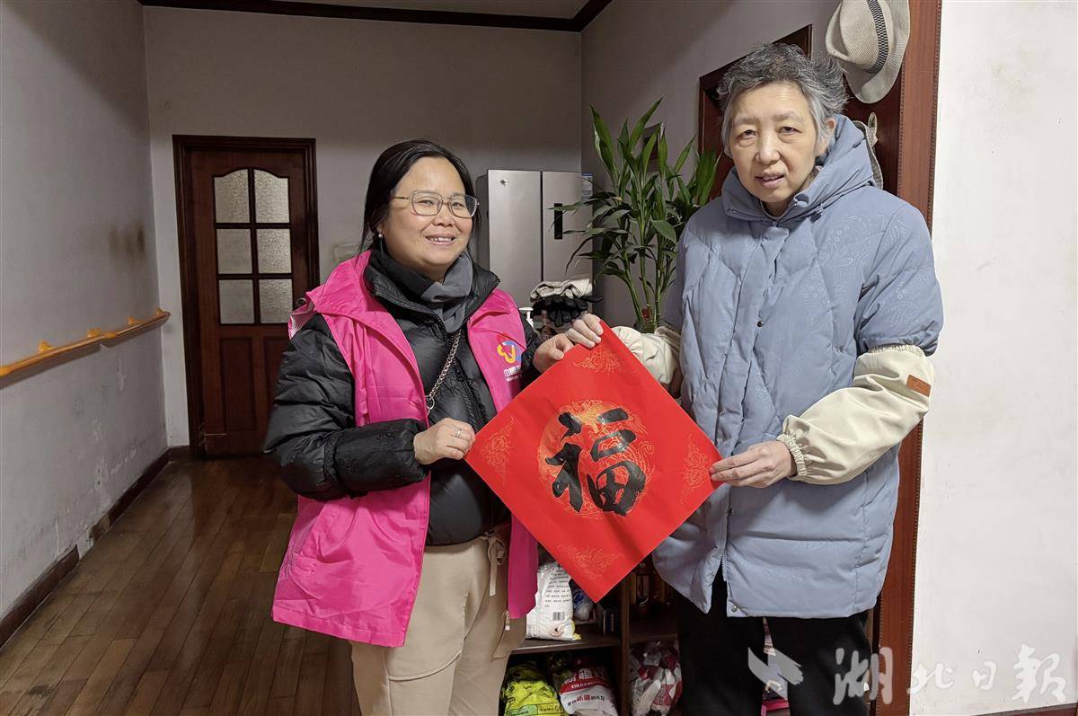 湖北日报讯(记者张华、通讯员卫美琴、周艳艳)“钱姐姐,快过年了,我们给您送‘福’来啦!祝您新的一年,福气安康,万事顺意!”春节临近,困难群众钱坤家里却暖意融融。武汉市武昌区南湖街道都市桃源社区妇联“暖心送关爱”慰问小组近日给她送上新春礼物和祝福。