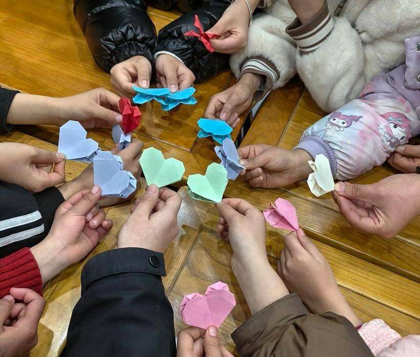 活动伊始,来自武汉商贸职业学院的大学生志愿者方静玲,带领孩子们开始了一场充满爱心的手工之旅。志愿者手把手地教孩子们压折、翻折、塑形,耐心解答每一个疑问。孩子们稚嫩的小手在彩纸间灵活穿梭,从一开始的生疏到逐渐熟练,一个个色彩斑斓的爱心在他们手中诞生。大家高举作品,互相展示,脸上洋溢着纯真的笑容。