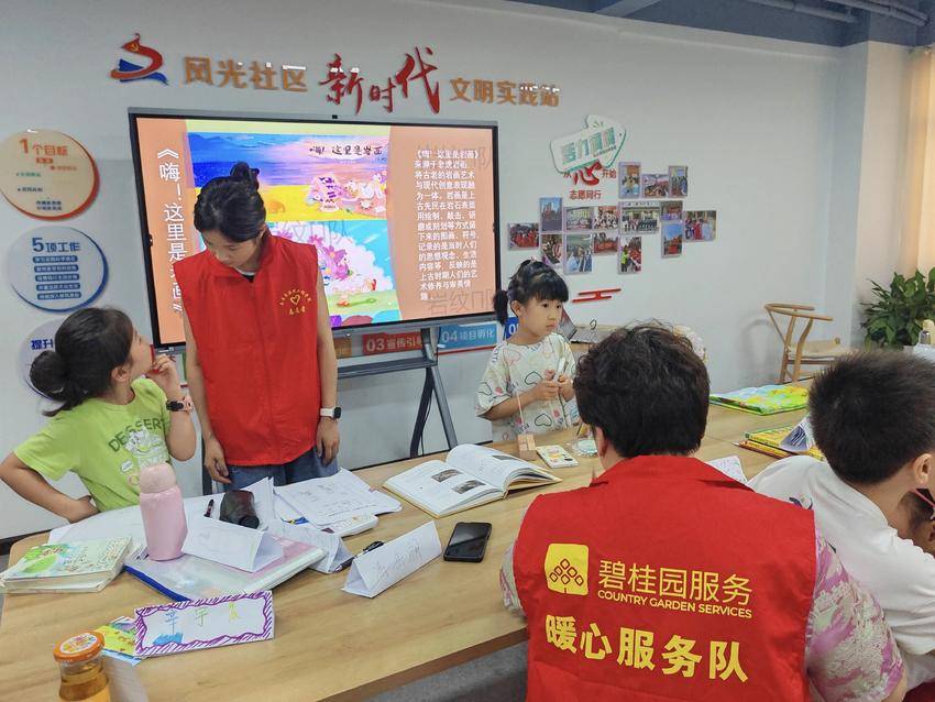 社区三楼的图书室和自习室可容纳接近200名孩子,社区物业协作,让托管班既安全又高效,随州碧桂园物业党员志愿者联动,确保孩子的安全,大学生志愿者为孩子们提供了多元化的课堂,实现“孩子有人管,家长能放心”。