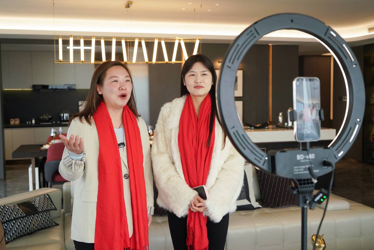 记者与主播曹瑞雪一起在直播间,向网友推介襄阳好房子。(湖北日报全媒记者 赵怡然 摄)