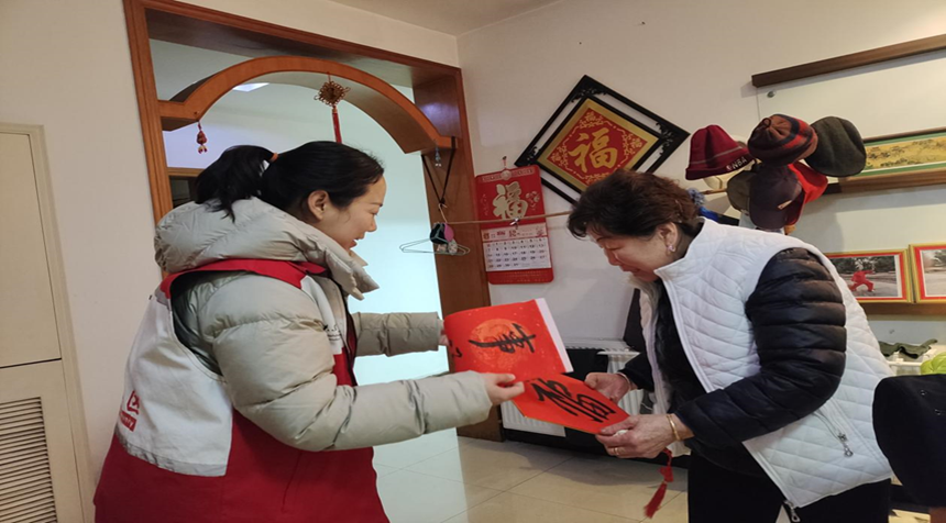 除了现场送春联,社区还组织志愿者慰问团队送祝福上门。为辖区高龄独居老人、残疾人士等家庭送上春联,向被慰问者讲解冬季用火、用电、用气规范,提醒定期检查燃气管道、电器线路。针对老年群体,志愿者们详细讲解电信诈骗、养老诈骗等骗局,告知老人“不轻信、不透露、不转账”。