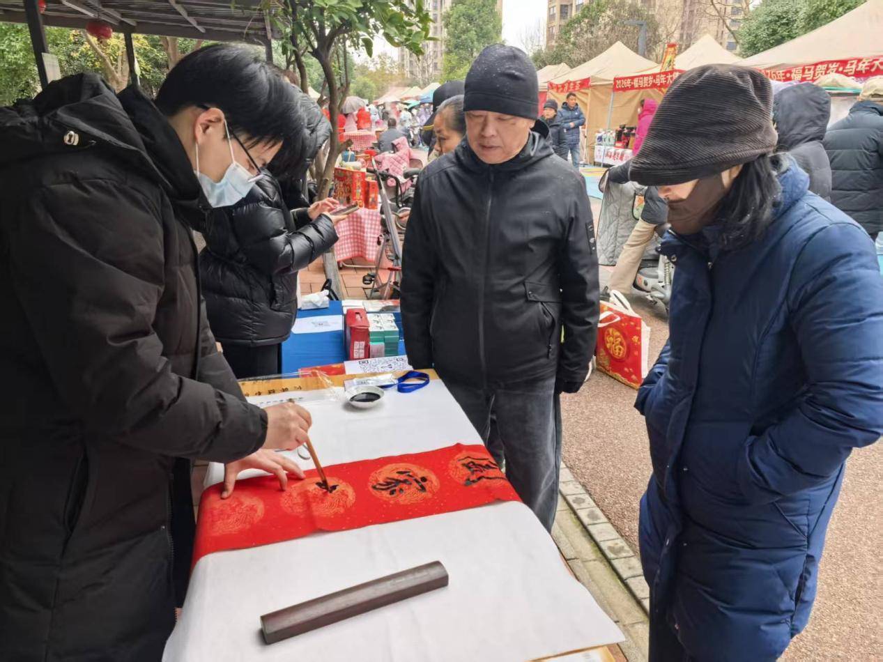 在翰墨送福区,社区特邀的书法爱好者现场挥毫泼墨,免费为居民书写春联、赠送“福”字。红纸铺开,墨香四溢的福字在书法爱好者的笔下一挥而就,瞬间成了“抢手货”。大家有序排队,把“福”带回家。