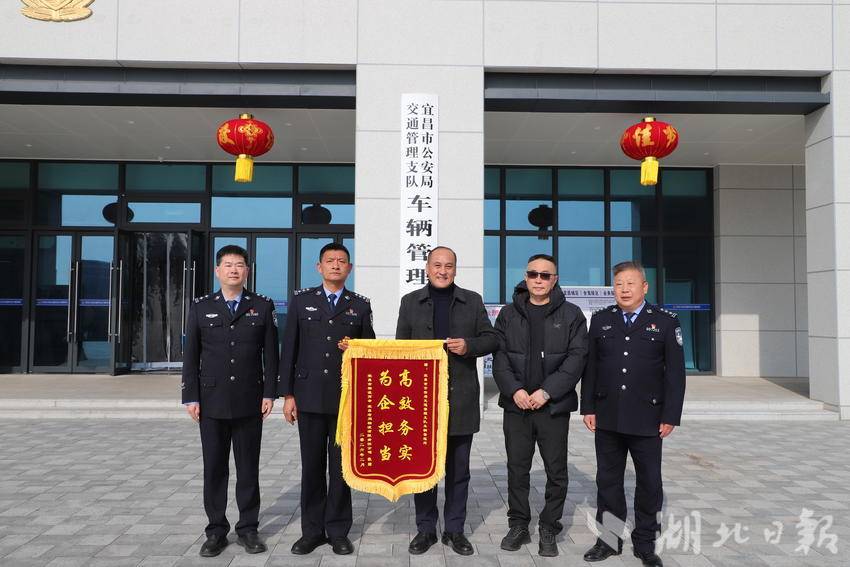 湖北日报客户端讯(通讯员姚华、殷钰)2月10日,是我国传统农历北方小年,空气中弥漫着欢乐喜庆的气氛。下午3点,宜昌市物流商会会长、宜昌市老周物流有限公司总经理周代创、副会长侯明专程来到宜昌市公安局交通管理支队车辆管理所,将一面印有“高效务实、为企担当”的锦旗送到车管所所长肖可可手中,感谢车管所民警坚持实事求是、高效履职,成功为企业化解重大风险、挽回经济损失。
