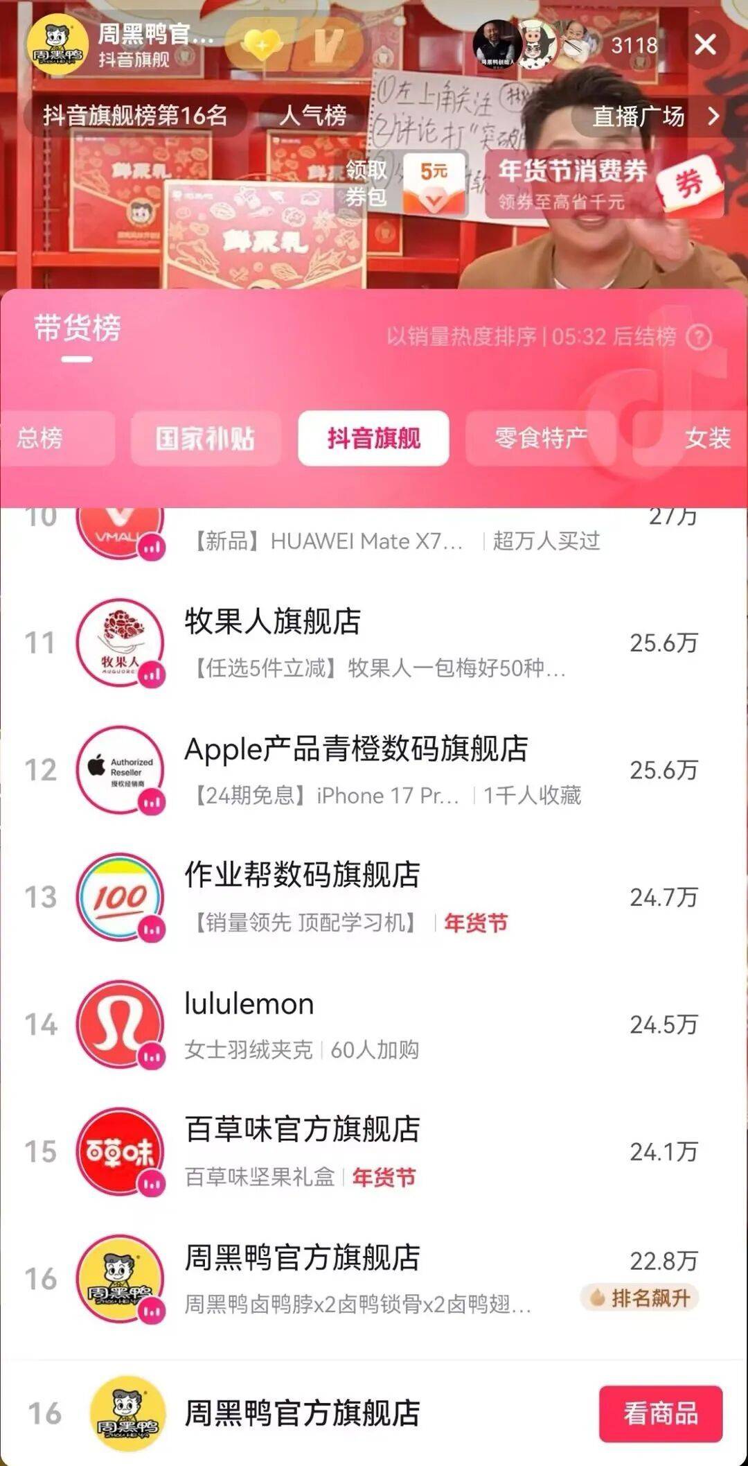 周黑鸭“谢谢你喜欢黑鸭味”年货专场直播排名热度飙升。