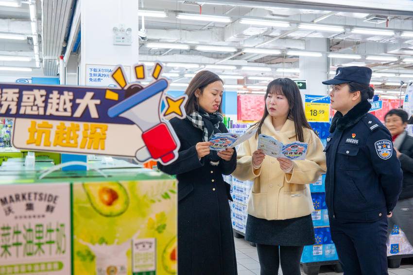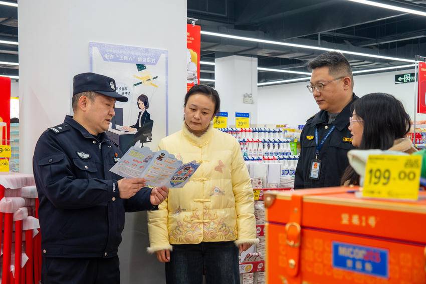 活动中,分局民警联合超市员工及社区志愿者,组成流动宣传队。经过培训的超市员工和志愿者们穿梭于各货区,结合当前高发的诈骗类型,向顾客生动讲解诈骗手法和识别技巧。特别有创意的是,收银员们也受邀成为“反诈宣传员”,在结账时附上一句简短温馨的语音提示,让反诈提醒成为购物体验的最后一环,深入人心。