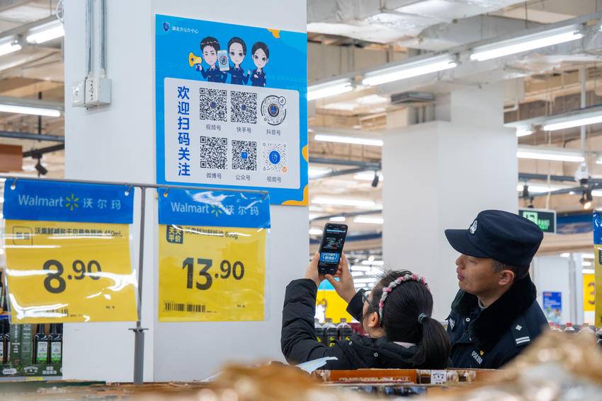 走进超市,浓厚的节日氛围与醒目的反诈提示相映成趣。“西红柿红红挂枝头,陌生好处别伸手”……一句句朗朗上口的反诈顺口溜,悬挂在货架间的吊旗上、印制在地面贴纸上,吸引着往来市民驻足观看、轻声念诵。在超市入口、收银台、服务台、电梯口等人流集中区域,摆放着形式多样的宣传立牌和海报;货架之间,精心设计的墙面海报悄然传递着防骗要点;出口处专设的宣传展台尤为醒目,不仅摆放着最新的反诈宣传折页和手册供市民自由取阅,还准备了实用的小礼品,奖励积极参与反诈问答的群众。