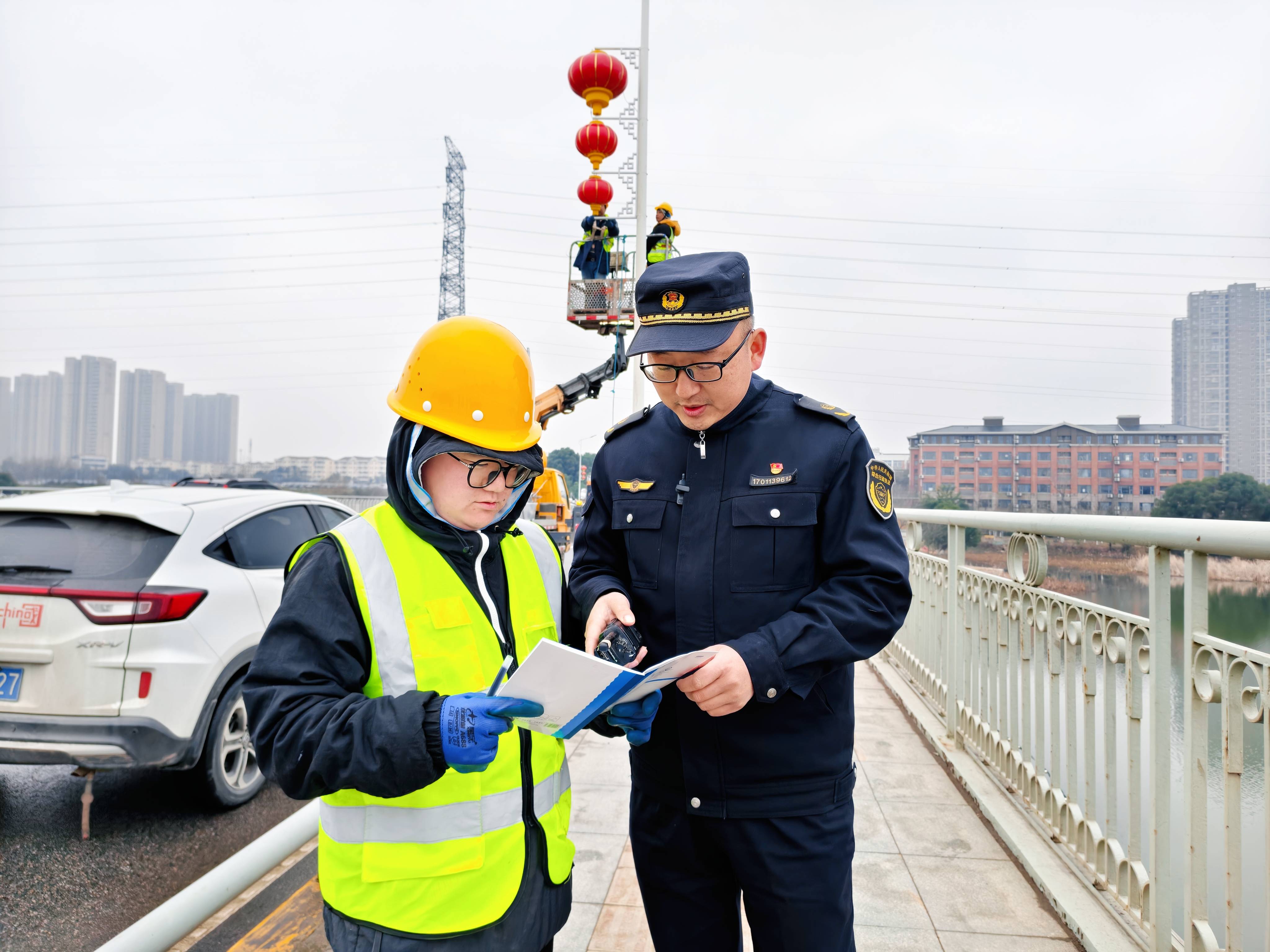 上午9时许,冯文褀沿太子湖北路、江城大道开展日常巡查。临近春节,辖区主干道新春亮化工程全面铺开,市政施工人员正忙着悬挂灯笼、安装灯饰、调试线路,一派繁忙有序的施工景象。登高作业车升降起落,工人们在高空紧张作业,地面上各类施工材料、工具摆放其间,为城市增添了浓浓的节日氛围。