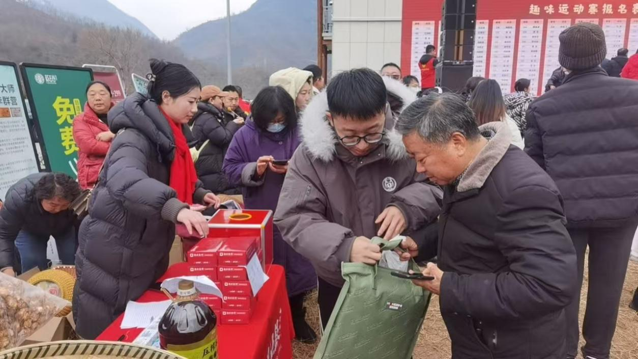 神农架阳日镇的年货集市上湖北银行神农架支行工作人员引导村民扫码答题兑换礼品