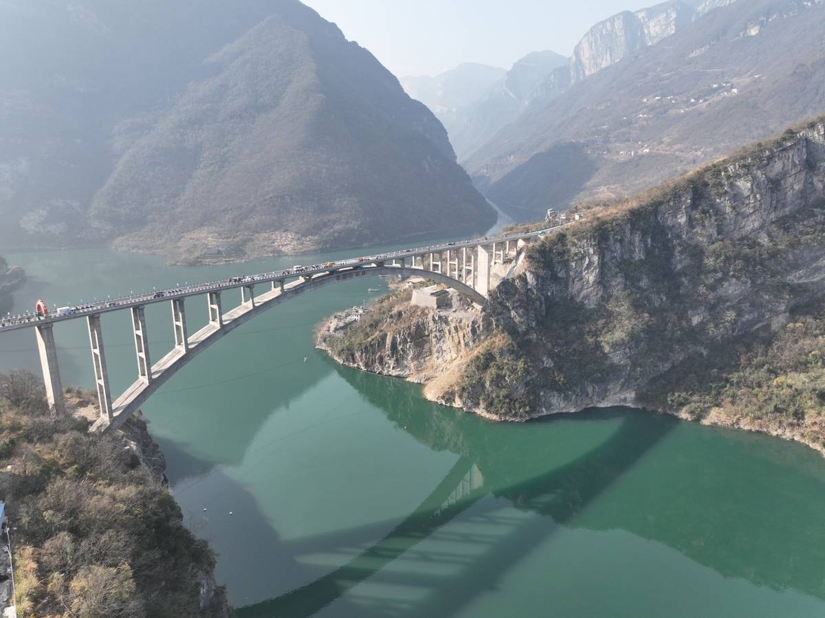 该项目于2022年5月20日开工建设,建设过程中克服了复杂地势地貌、大型机械无从施展等多种不利因素。专家团队反复勘测与模拟,更改设计方案,创造性提出了“拱座后移,增大跨径”的处置方式,由此大桥主拱圈在国内首次采用高低非对称布置。