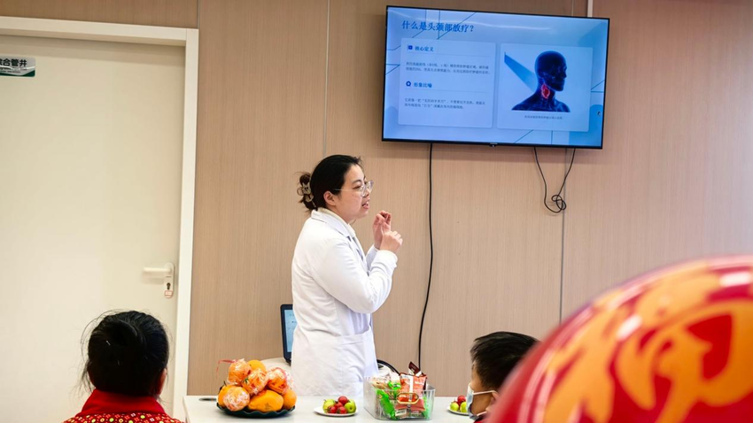 苟晓雪医生围绕头颈部肿瘤放疗期间口腔护理、咽喉保护、春节膳食搭配、不良反应预防处理等内容开展专题科普,用通俗易懂的语言讲解实用康复知识,现场答疑解惑,为患者顺利治疗、安心过年筑牢健康基础。