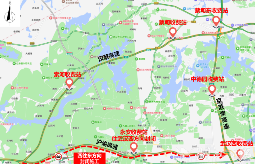 沪渝高速西往东(汉蔡高速往京港澳高速武汉西收费站)方向封闭施工,仙桃往武汉市区方向禁止车辆通行。