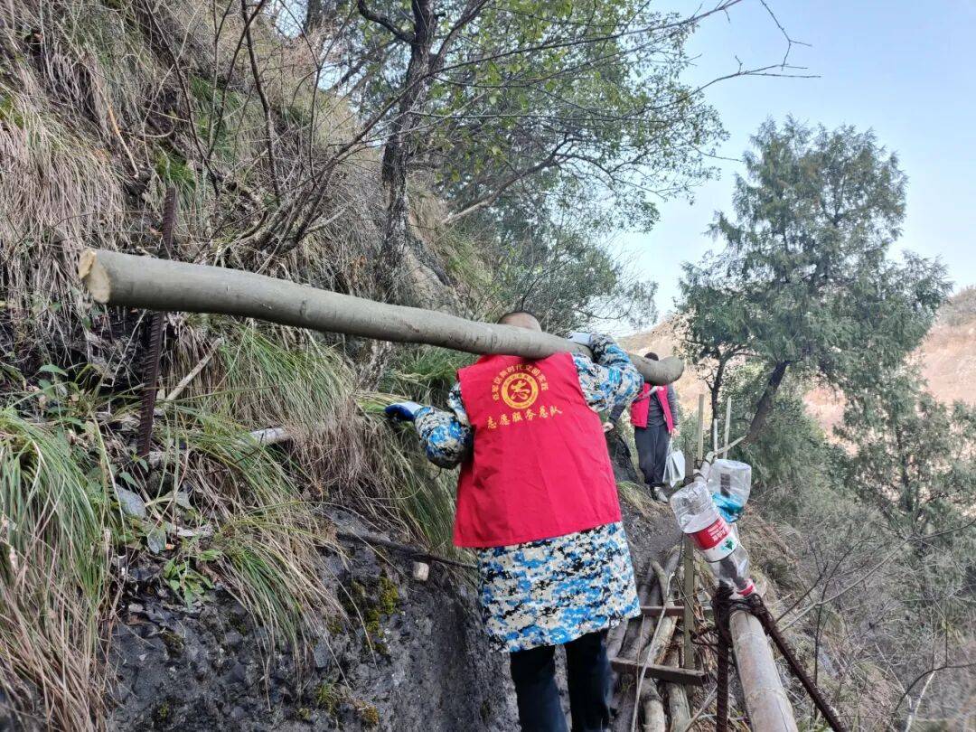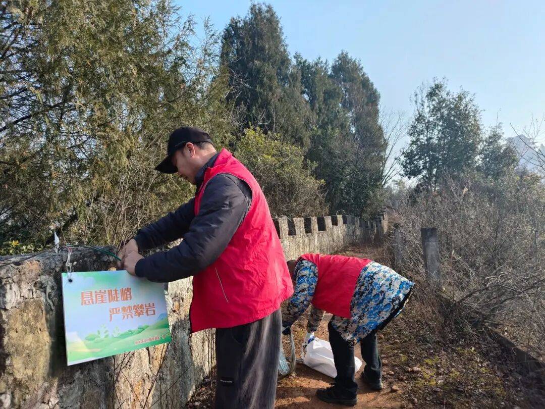 针对辖区文佛山、步道等生态重点区域,楠木溪村组建专项清理队伍,沿着山林步道逐段排查、集中清扫,清理废弃塑料袋、饮料瓶、果皮纸屑等各类垃圾,全力守护联棚乡绿水青山的生态底色。此外,部分路段因雨水冲刷出现松动破损带来的安全隐患,村干部、党员志愿者与文佛山寺庙居士合力,搬运木材加固栏杆,夯实松动路基,并对陡坡路段进行防滑处理,共修缮山路小道200余米,有效保障了出行安全。同时,结合冬季安全防护要求,村干部在辖区陡坡等危险地段,有序增设“悬崖陡峭 严禁攀岩”等安全警示标识,进一步筑牢安全防线,切实保障村民及游客出行安全。