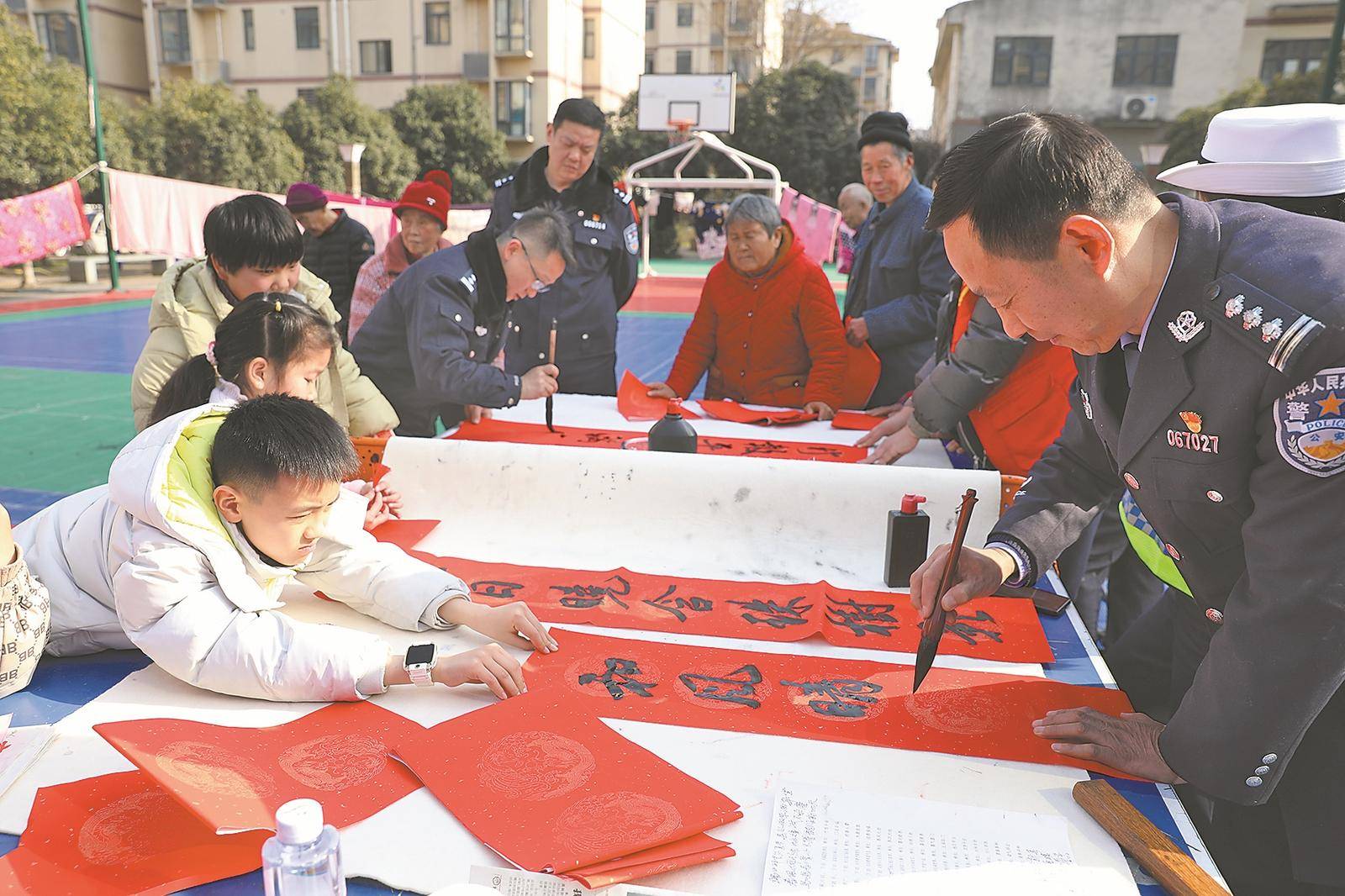 2月12日,在东津新区史台社区,襄阳市公安局交管支队交警四大队联合东津分局六两河派出所开展“交通安全有奖问答、送春联‘福’字”主题宣传活动,将平安祝福送到居民身边。