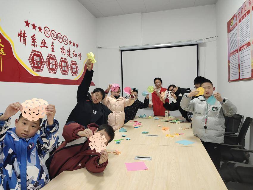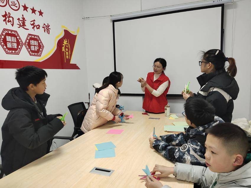 除了实用的作业辅导,趣味手工课程更是让课堂充满了欢声笑语。书签制作课上,孩子们发挥想象力和创造力,用彩纸、画笔等材料,制作出一个个色彩鲜艳的书签,不仅锻炼了动手能力,更将对阅读的热爱融入其中。剪纸课程上,社区工作人员详细讲解剪纸的基本技巧和方法,孩子们认真聆听、细心操作,握着小小的剪刀,在彩纸上灵活穿梭,一个个精致的剪纸作品渐渐成型,孩子们在“剪”与“折”的趣味互动中,感受传统手工艺的独特魅力,播下文化自信的种子。