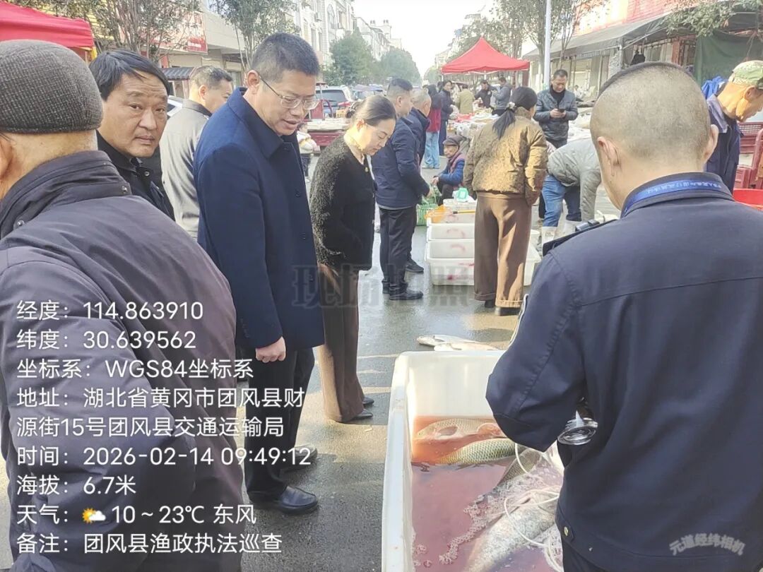 湖北日报客户端讯(通讯员:王真)春节临近,团风长江段涉渔违法行为进入高发时段。为斩断非法捕捞销售链条,守护长江生态安全,2月14日,团风县农业农村局局长冯国彪带队深入城区农贸市场,渔具店开展长江禁渔专项执法检查。团风县农业农村局副局长易玲,县农业综合执法大队大队长占志刚,县公安局民警刘佳琦等参加。