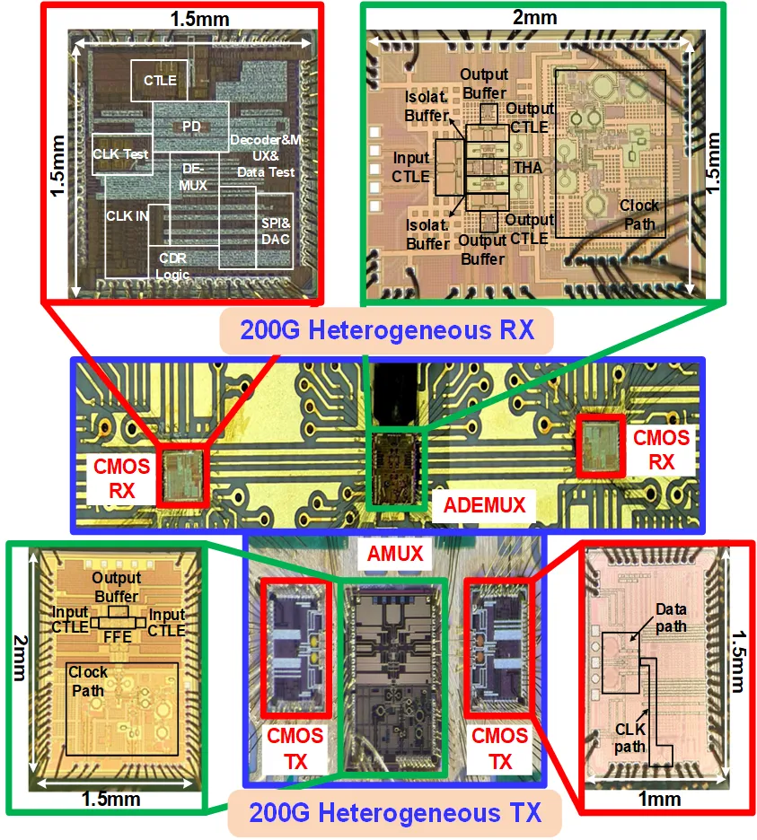 200Gb/s PAM4异质集成收发机芯片照片。