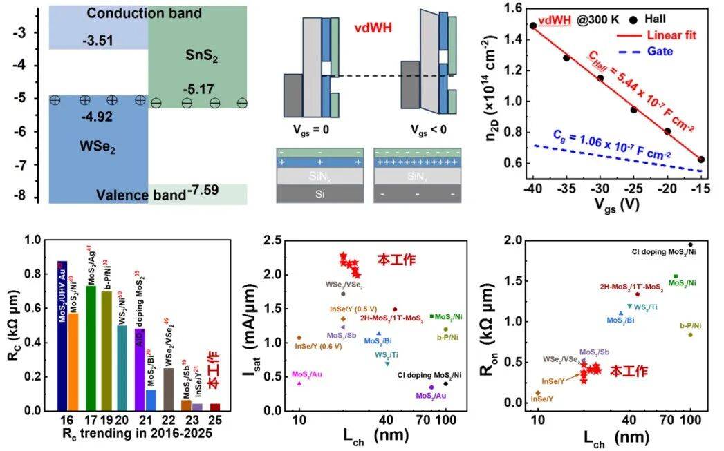 湖南大学段曦东、东南大学赵蓓团队提出了针对P型二维半导体的栅控超掺杂策略,通过构建1L-SnS2/2L-WSe2Ⅲ型能带范德华异质结构,实现可调层间电荷转移掺杂,突破传统静电掺杂的极限,获得1.49×1014cm-2超高空穴浓度、0.041 kΩ·μm超低接触电阻与2.30 mA/μm超高开态电流密度,性能达国际领先水平。该成果发表于《科学》杂志(Science, 2025, 388: 1183-1188)。
