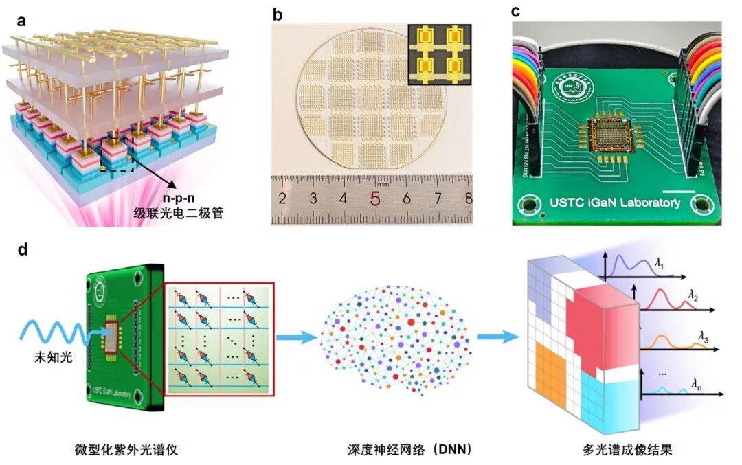 中国科学技术大学孙海定教授iGaN实验室联合武汉大学刘胜院士团队,成功研制出具有纳秒级响应的超快微型紫外光谱成像仪芯片。该芯片基于级联光电二极管阵列架构,并与深度神经网络算法相融合,利用“电压调制-电子解调”新型光谱成像原理,实现高精度光谱探测与高分辨多光谱成像,为光谱分析设备小型化、智能化和大规模集成化提供新路径。该成果以发表于《自然·光子学》杂志 (Nature Photonics, 2025, 19: 1322–1329)。