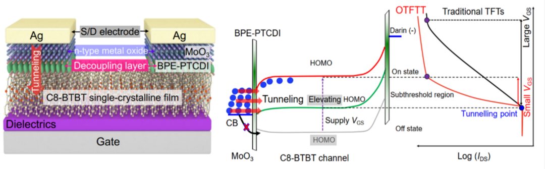 有机隧穿晶体管器件结构和工作机理。