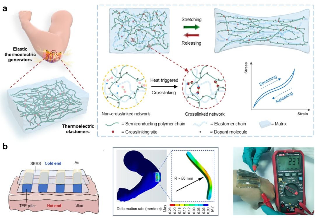 北京大学雷霆团队在国际上报道首个“热电橡胶”半导体材料,突破传统热电材料刚性与脆性限制。通过纳米相分离、热激活交联与定向掺杂策略,实现高ZT值(0.49)、高拉伸与高回弹性的协同统一。基于该材料的全弹性热电发电模块,具有低模量贴肤特性,可稳定收集人体热能,为可穿戴电子持续自供能与柔性制冷提供全新路径。该成果发表于《自然》杂志(Nature,2025, 644: 920-926)。