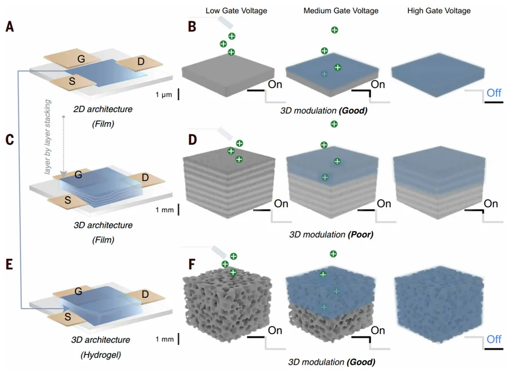 3D水凝胶半导体和晶体管示意图。