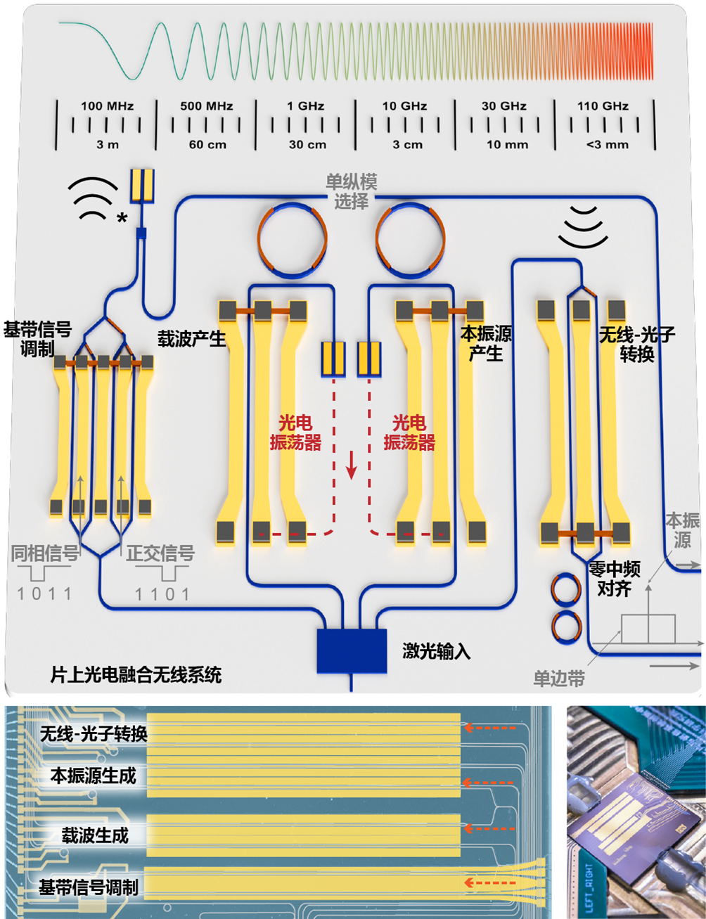 北京大学王兴军、舒浩文和香港城市大学王骋研究团队,成功攻克了兼容大规模晶圆级制造与超大电光调制带宽特性的核心工艺难题。在薄膜铌酸锂集成工艺平台上实现超宽带薄膜铌酸锂光电融合芯片,首次实现了覆盖0.5 GHz至115 GHz超宽频带的任意频点无线信号产生、调制、发射与接收,最高无线传输速率达120 Gbps,为未来更畅通可靠的6G无线通信提供保障。该成果发表于《自然》杂志(Nature, 2025, 645: 80-87)。