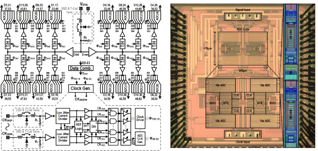澳门大学陈知行、张明磊团队在国际上首次成功突破高速ADC在宽频输入下的性能瓶颈,成功实现了72 GS/s 9b时间交织流水线辅助SAR ADC。通过引入交流交叉耦合与高频自适应补偿机制和双路径自举开关在宽带范围内实现高线性度模拟前端,结合基于电阻网络的开环残差放大器构建的ADC,为下一代光通信所需高速及高精度信号采集提供了解决方案。