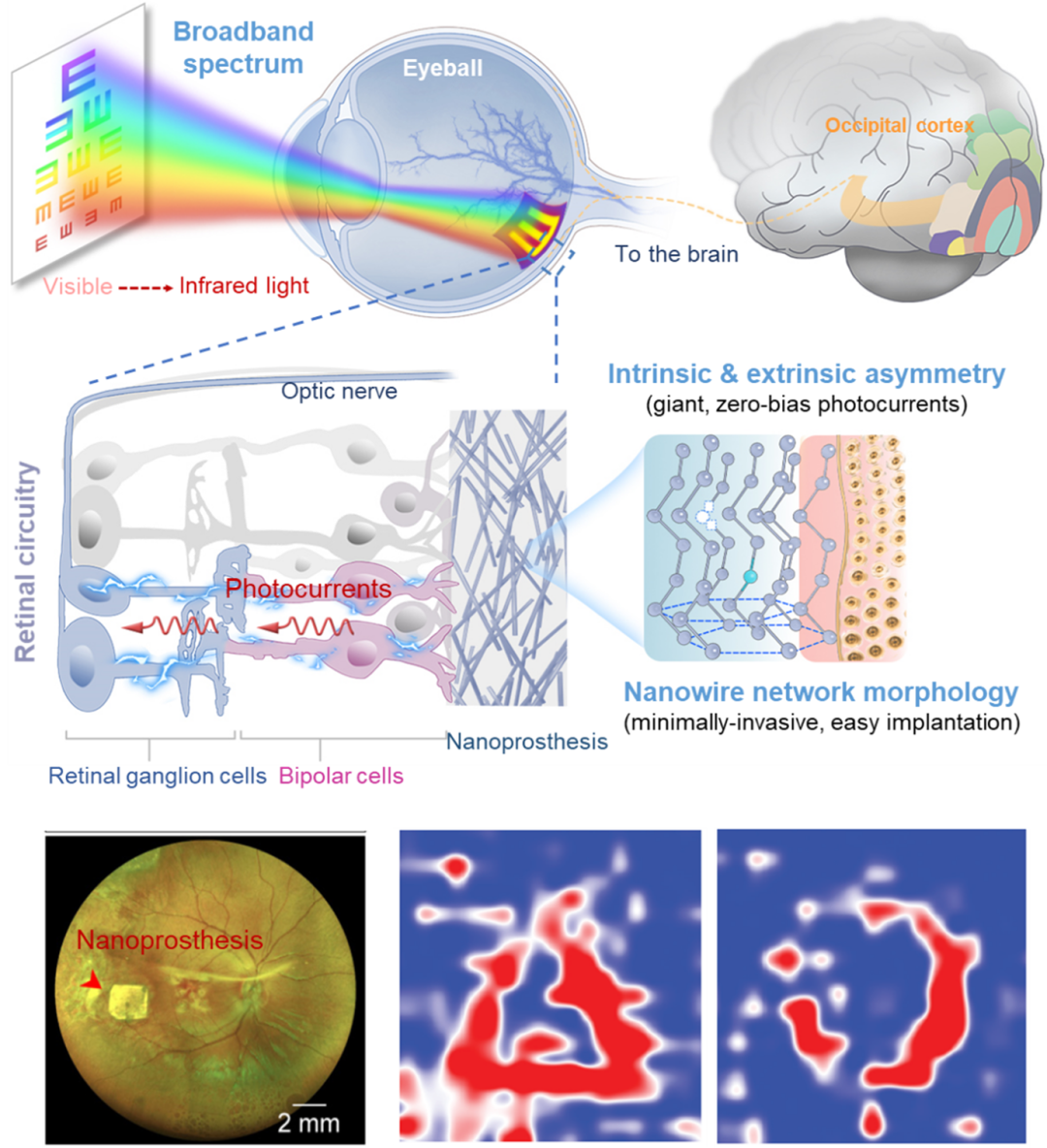 复旦大学周鹏-王水源、张嘉漪和中国科学院上海技术物理研究所胡伟达团队合作研制出全球首款响应覆盖470-1550 nm的视网膜纳米假体器件,通过对称破缺增强设计,在零压下实现宽谱高效光电转换,突破传统假体外部模块依赖与窄谱局限,在啮齿类和灵长类盲动物模型中恢复可见光视觉并获红外增强功能,为发展医工交叉生物智能技术开辟新路径。