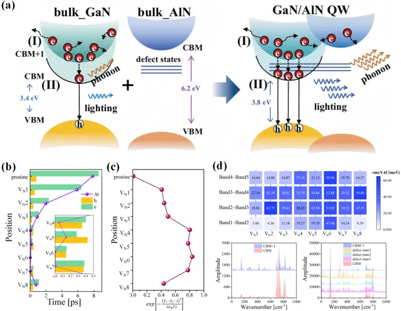 中国科学院长春光学精密机械与物理研究所石芝铭、孙晓娟、黎大兵研究员团队联合宁波东方理工大学魏苏淮教授团队针对GaN基LED载流子不对称注入问题开展理论研究。揭示了电子弛豫缓慢是导致载流子注入不对称的物理本质。创新提出在GaN/AlN量子阱界面引入氮空位作为电子弛豫“阶梯”,并增强电声耦合,使电子冷却时间由8.61 ps缩短至0.15 ps,实现与空穴对称注入,显著缓解泄漏损失。该工作为突破氮化物发光器件效率瓶颈提供了全新的缺陷工程调控思路。