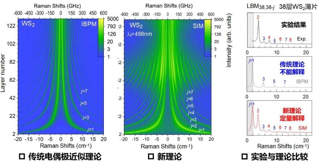 传统电偶极近似理论和新理论所计算的层状半导体薄片呼吸声子拉曼强度及其与实验结果的比较。