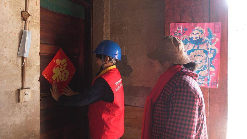 看到队员们,徐婆婆开心地挥手招呼大家进屋。队员们与老人围坐在一起,手拉手话家常,了解她最近的身体情况和生活状况。来自湖北航天医院的志愿者为徐春桥老人测量血压,进行心肺诊疗,并对老人身体关节进行触诊,了解老人的病史、饮食、睡眠习惯等,根据她的身体状况给出了针对性的治疗建议。其间,服务队的队员们将带来的春联为老人贴好,并为老人打扫房间、整理物品,检查老人家中的用电设备,确保冬季用电安全。