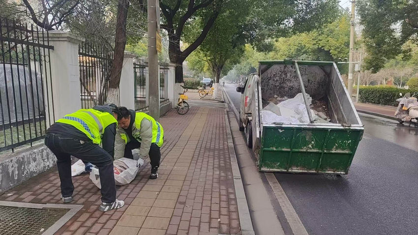 发现该情况后,冶金街道综合执法中心迅速行动,立即组织力量前往现场进行联合处置。工作人员对散落的砖块、混凝土砌块等废弃物进行了集中装袋清理,共清理清运建筑垃圾十余袋,并动用垃圾清运车辆两车次,彻底消除了该路段的安全隐患。